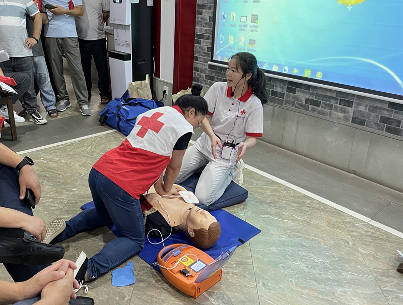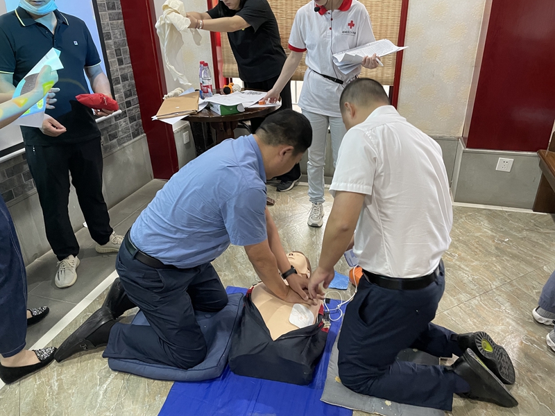 培训现场,区红十字会培训老师对心肺复苏、AED使用、异物梗阻、创伤救护及包扎等急救避险知识进行了宣传讲解和操作演示。参加培训的员工认真观摩、演练。 培训结束后,学员们就包扎、心肺复苏、AED使用进行了理论和实操考试。