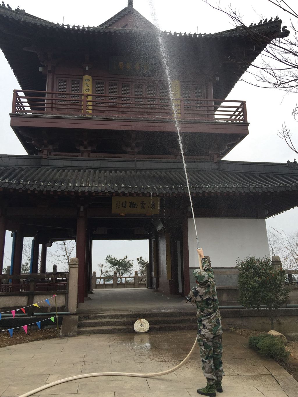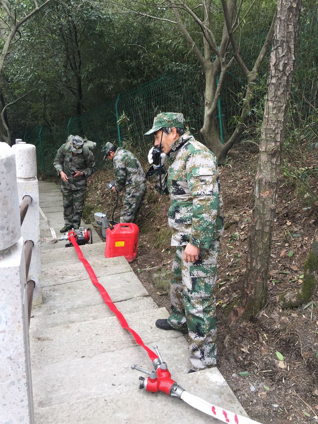 随后又进行了山林引水灭火演练,灭火队分两组,第一组以梅园咏梅亭河沿为取水点,使用高压森林消防泵进行取水。第二组以梅山山顶为终点使用高压森林消防泵,进行安装调试后,再从水泵出水口连接水带至梅山顶。二台水泵串联至梅山山顶,喷头出水距离约6米,从引水到出水共用时4分40秒,引水灭火演练顺利完成。