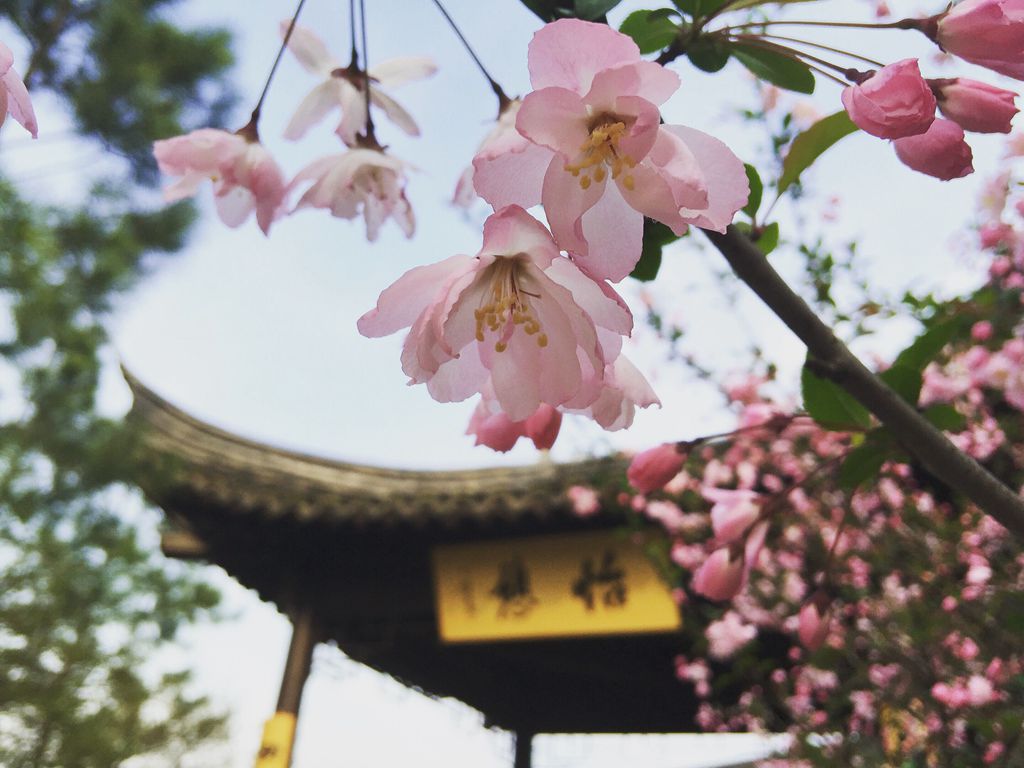 细看这些枝头绽放的精灵,粉色的花瓣中若隐若现地吐露着淡黄色的花蕊,如初露心事的少女。这些精灵又如此无惧无畏,花期短暂却毫无保留。