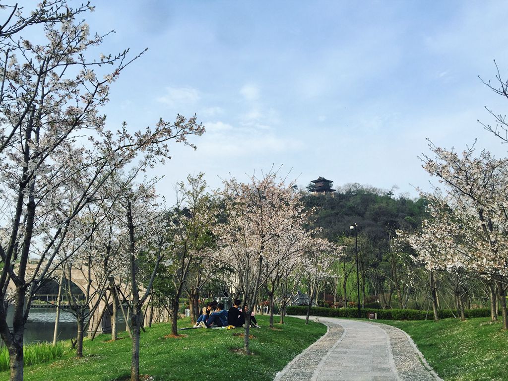 广玉兰亭亭玉立,垂丝海棠灼灼灿灿,桃花粉面嫣然,一树树的樱花层层叠叠地萦绕在周围。放眼望去如烟似云,霸道地占据着公园的每一个角落,又淡雅得如此纤尘不染,让人感受洗尽铅华后的从容。漫步公园长272米的樱花林,两边的樱花盛开得如火如荼,仿佛置身于无尽而蜿蜒的粉色隧道,错落了时空。