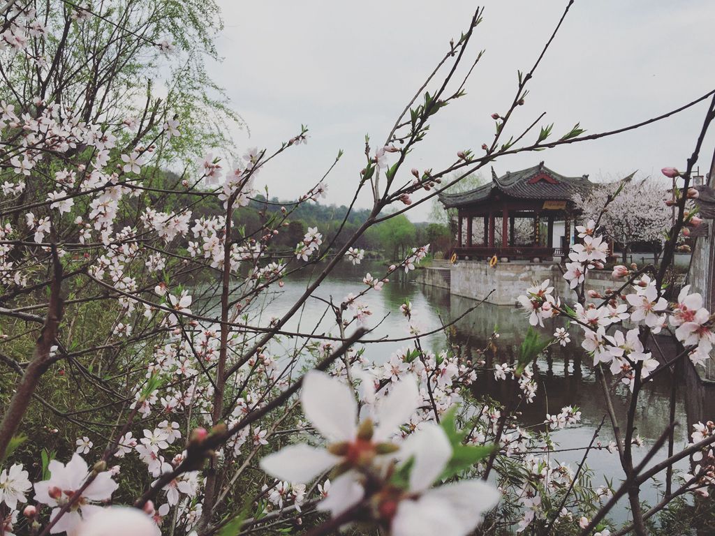 粉色的樱花绽放着宁静的浪漫,树下的芳草地绿得纯粹,坐于樱花树下等待黄昏散落一片金色的落日余晖。天色、湖面、垂柳、樱花构成了一副唯美的画卷,令人心醉。走进画卷,任春风轻拂,洋洋洒洒的樱花雨便随风扑面而来,吹入心田。此刻,躁动的凡尘之心也变得沉寂,似除去了所有的杂念和尘垢。