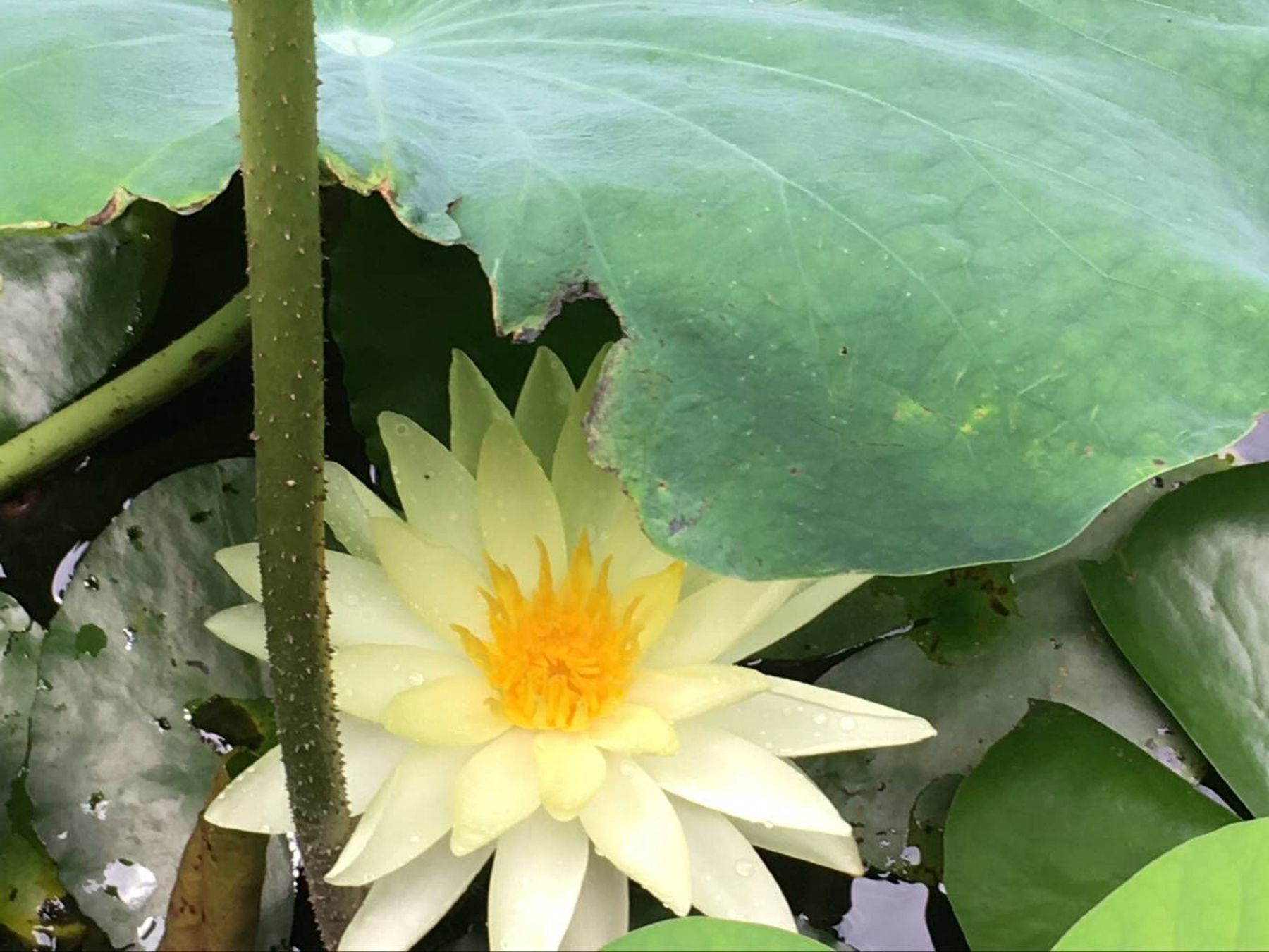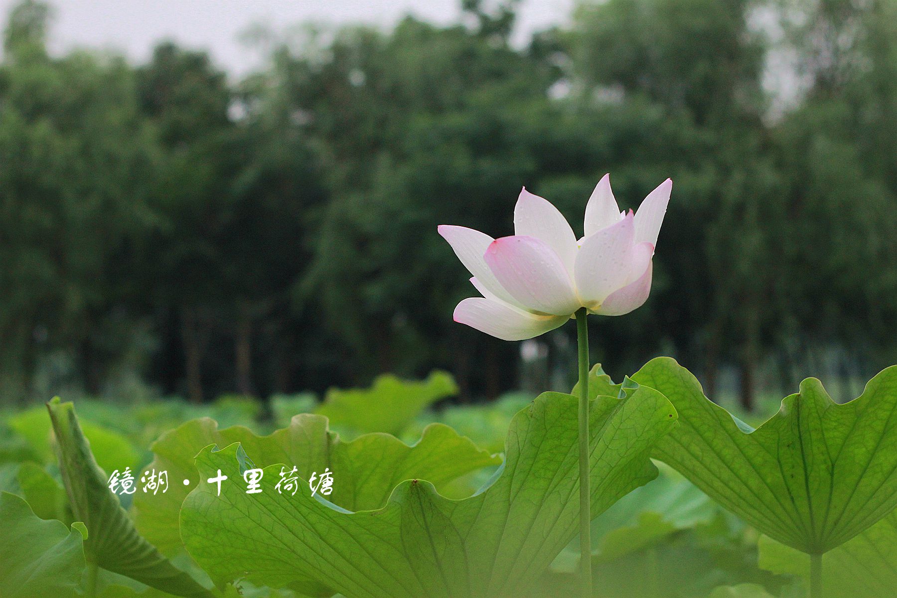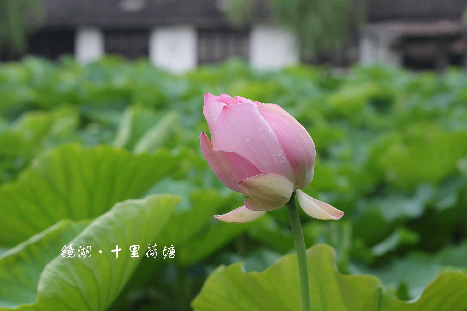 立于公园内的古桥上,放眼望去尽是田田荷叶。连绵不绝的荷叶正是应了那句“接天莲叶无穷碧”。一阵细雨,荷叶上跳动着雨滴,最后凝结在一起,颇有大珠小珠落玉盘的美妙。而初夏时分的荷塘,或是含苞待放,或是芙蓉初发,或是亭亭玉立,或是犹抱琵琶半遮面。粉色、白色的花蕾在碧绿的荷叶间更显高洁、清丽。