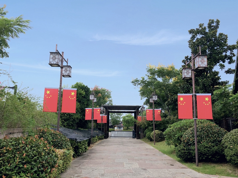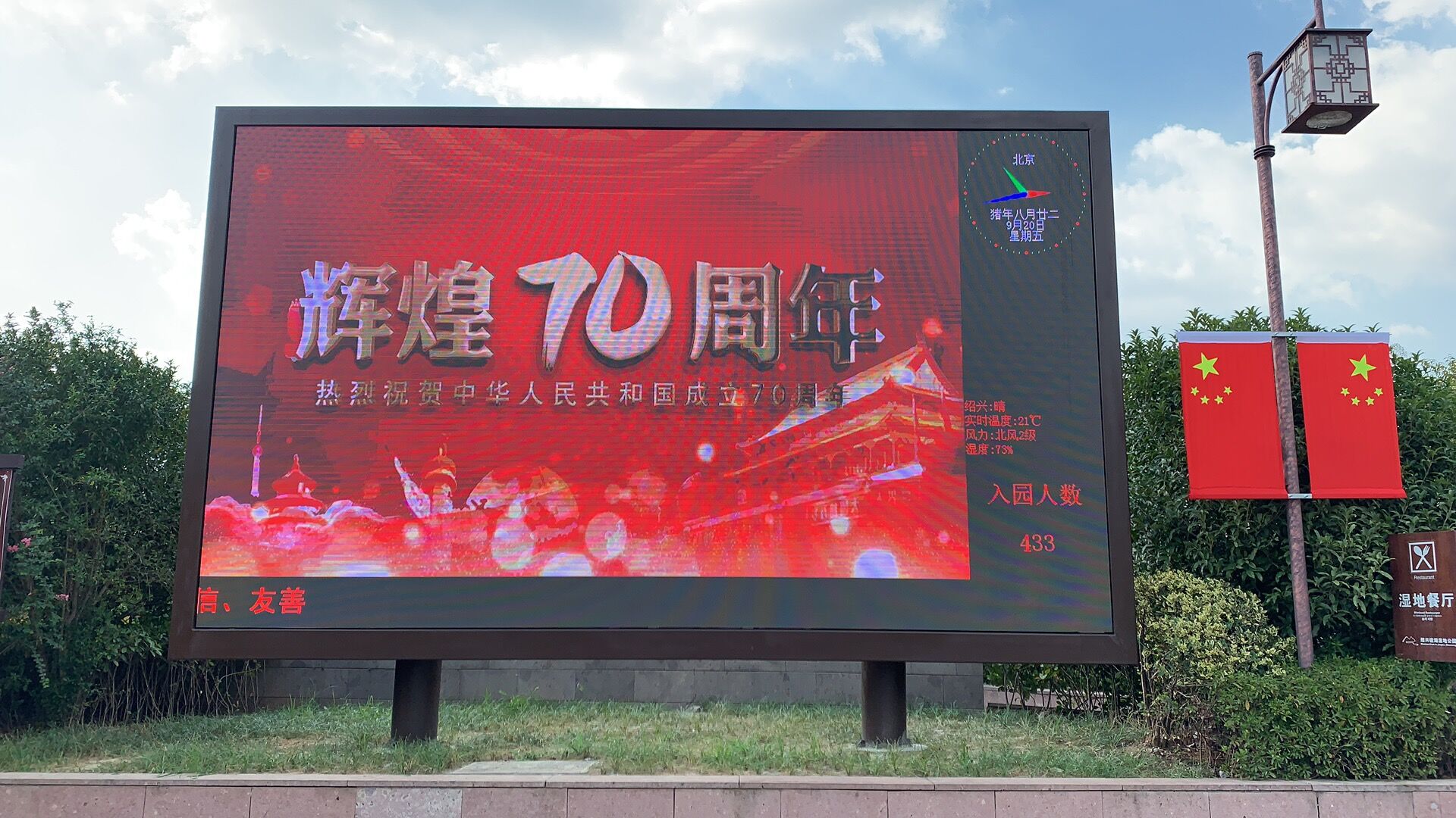 公园内LED屏上滚动播放70周年为主题的宣传片和宣扬社会主义核心价值观的公益广告,进一步渲染节日氛围。园路两侧的路灯都悬挂了国旗,紧扣国庆主题,更为公园增添了一抹“中国红”。