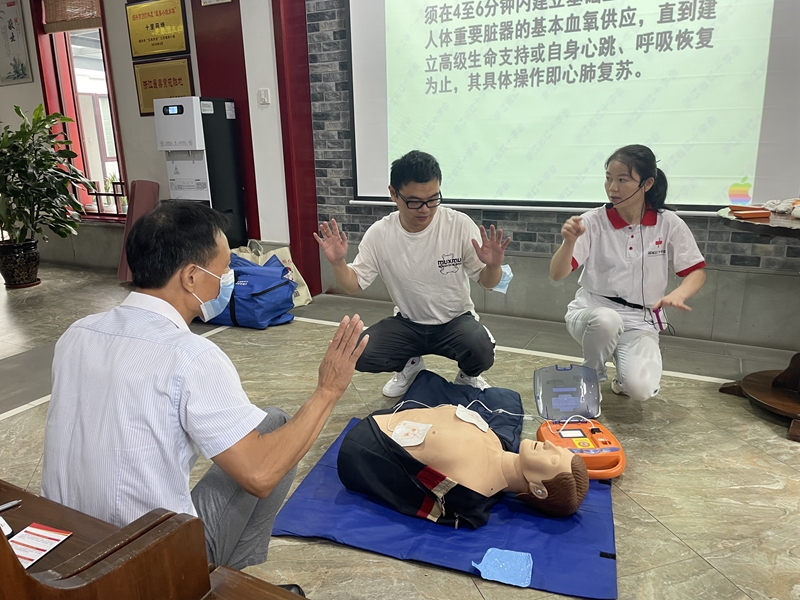 培训现场,区红十字会培训老师对心肺复苏、AED使用、异物梗阻、创伤救护及包扎等急救避险知识进行了宣传讲解和操作演示。参加培训的员工认真观摩、演练。 培训结束后,学员们就包扎、心肺复苏、AED使用进行了理论和实操考试。