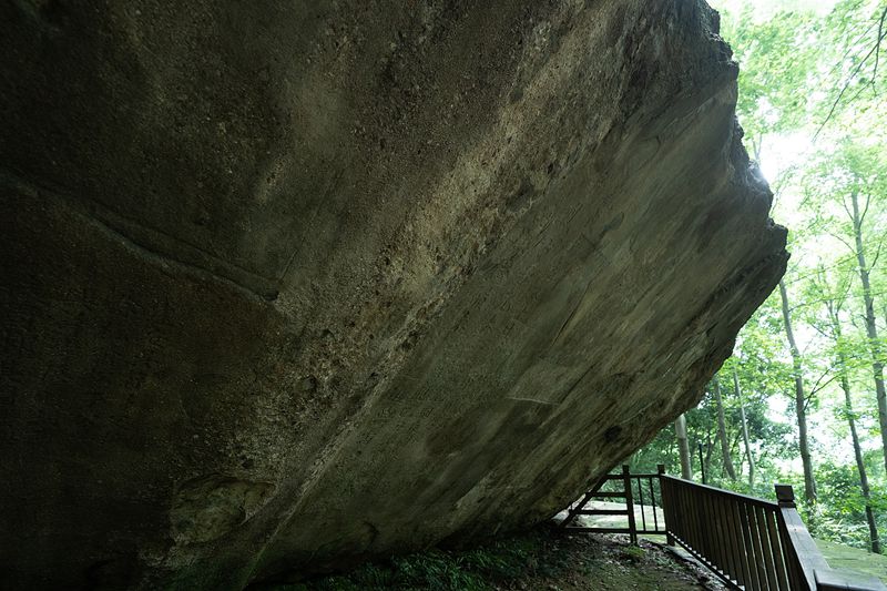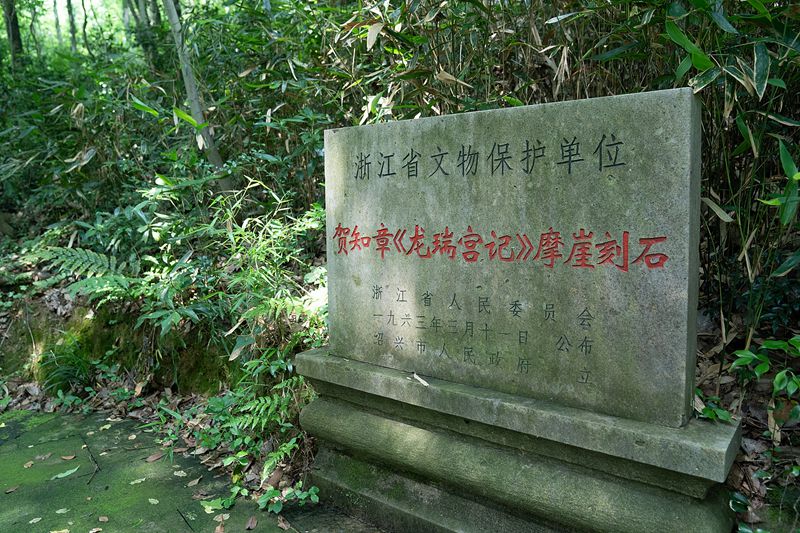 50度角倾斜,具有一定的遮风挡雨的效果,阳明先生就是在这石下打坐修行。而在飞来石上刻有贺知章等明贤的题名,也就是摩崖石刻。位于摩崖石刻正中间的是贺知章先生的龙瑞宫记,是摩崖石刻上最为有名的一篇著作。