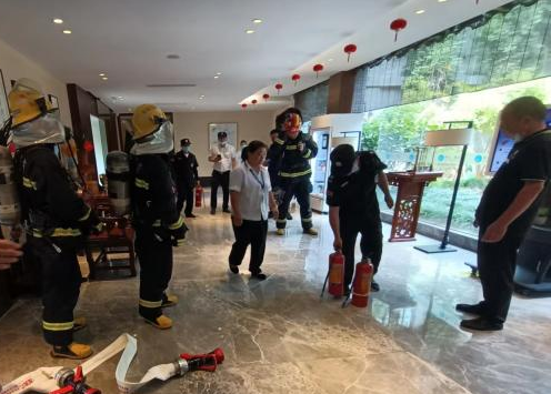 工作人员还在消防队员的指导下模拟了酒店前台冰柜失火的演练。出现火情后,工作人员立即报警,消防队员接警后迅速到达现场,利用高压水枪进行灭火,随后指导工作人员用手提灭火器扑灭冰柜火苗。