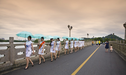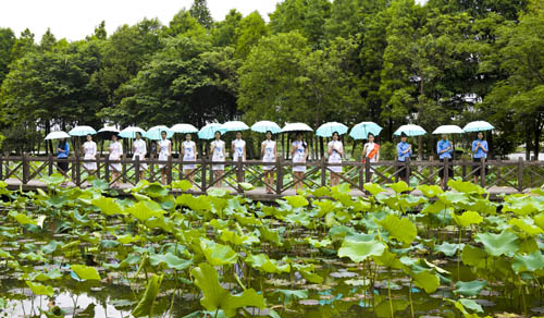 荷花仙子们走过范蠡桥,带领游客绕荷塘一周